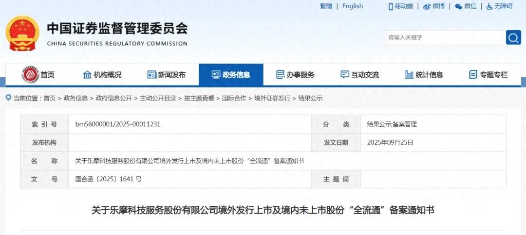 中国证监会网站近日发布关于乐摩科技服务股份有限公司境外发行上市及境内未上市股份“全流通”备案通知书,意味着这家共享按摩椅企业已取得进行香港上市聆讯的前置要求,或很快在港交所进行上市聆讯。
